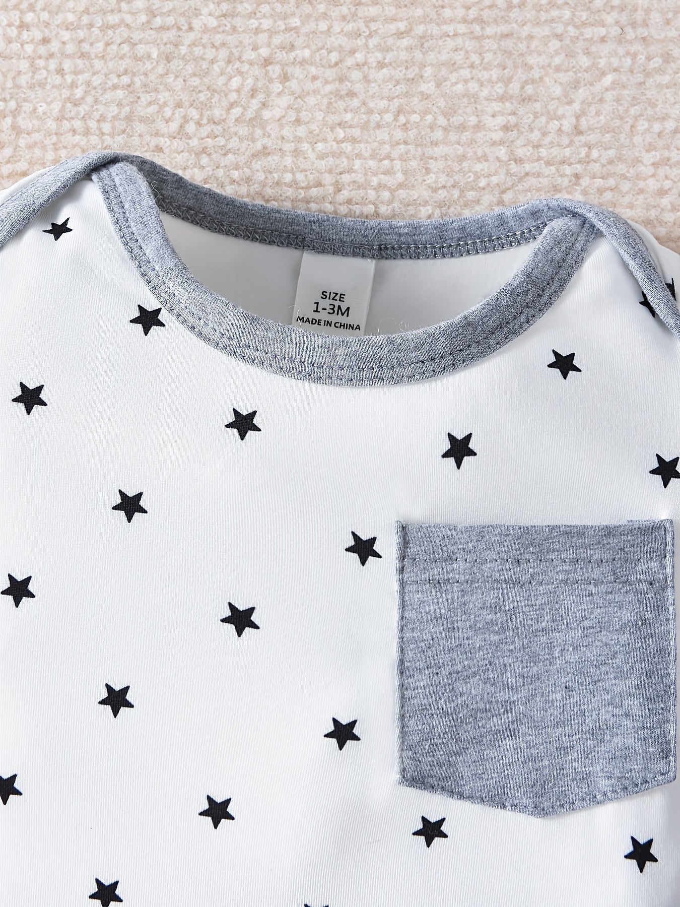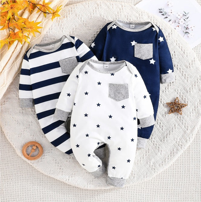 סט שלושה אוברולים מקסימום, מעוצבים בקווים נקיים ונעימים בגווני כחול, לבן ואפור, עם הדפסים ים של כוכבים ופסים – כי גם לקטנטנים מגיע סטייל ייחודי מהיום הראשון.